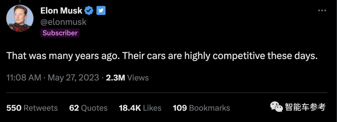 而这个片段最近得到了马斯克的回应,他说这是很多年以前的视频,“现在比亚迪的汽车非常有竞争力。”
