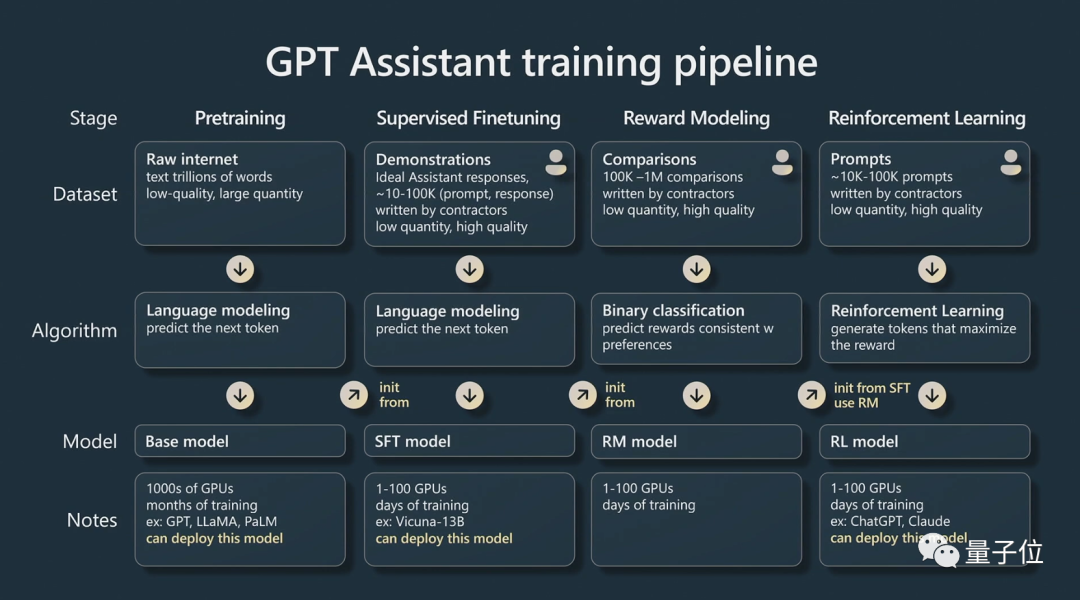 Karpathy主要讲述了AI助手的四个训练阶段: