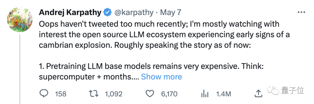 最近他发推特表示,目前对开源大语言模型生态系统的发展饶有兴趣,有点像早期寒武纪爆发的迹象。