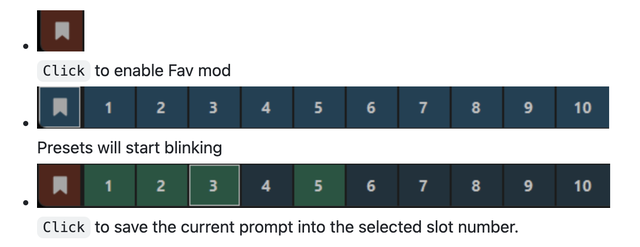 △点击第一个按钮启用Fav mod,然后预设将开始闪烁,点一下就可以将当前prompt保存到所选的插槽号中。