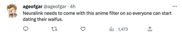 Neuralink需要搭载这个动漫滤镜(anime filter),这样每个人都可以与他们的waifus(动漫、漫画、游戏等虚拟世界的女性角色)约会了。