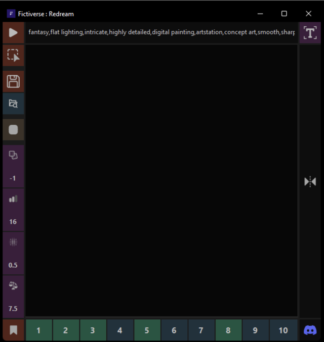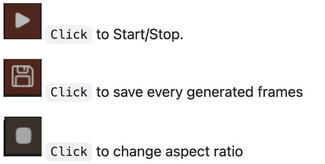 △从上到下,分别是启动/停止按钮、保存按钮(保存生成的每帧画面)、更改纵横比按钮