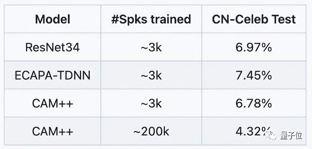在行业主流的中英文测试集VoxCeleb和CN-Celeb上,CAM++均刷新了最优准确率。