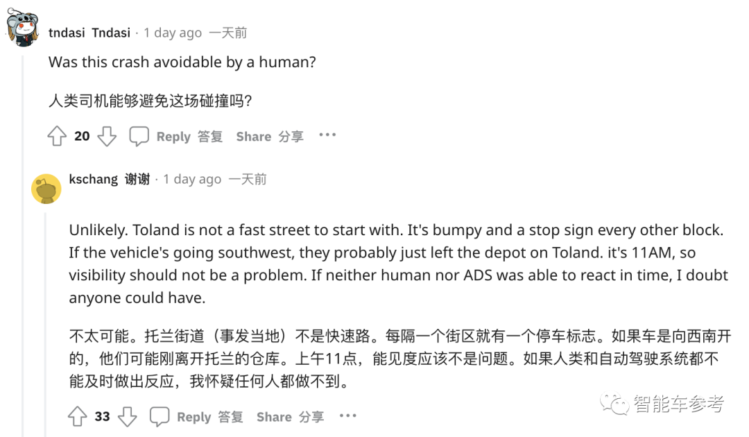 有人说,即便是人类司机开车,也很难避免这场事故发生。