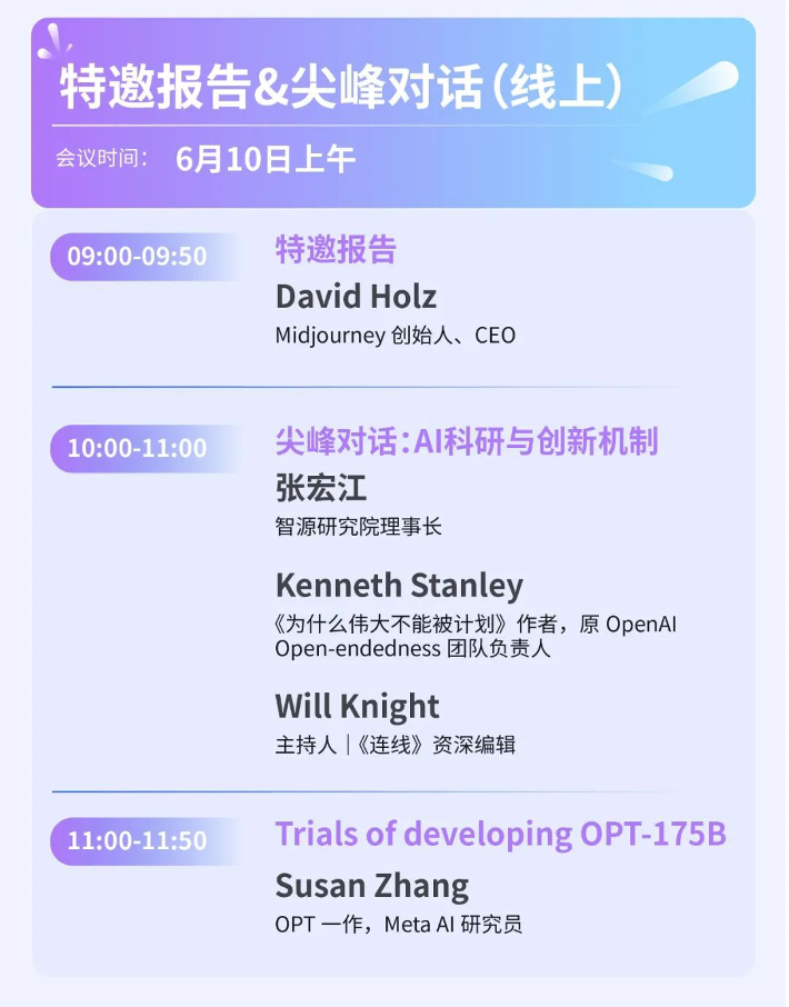 6月10日议程包括生成模型论坛,AI系统论坛,基于认知神经科学的大模型论坛,AI生命科学论坛,AI安全与对齐论坛,自动驾驶论坛,AI开源论坛,智能的物质基础论坛。