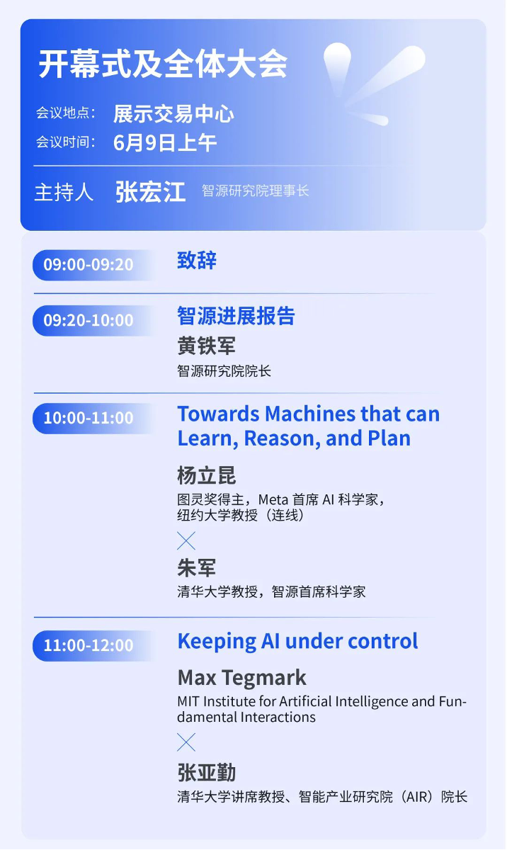 6月9日首日议程包括基础模型前沿技术论坛,类脑计算论坛,视觉与多模态大模型论坛,具身智能与强化学习论坛,大模型新基建与智力运营论坛。