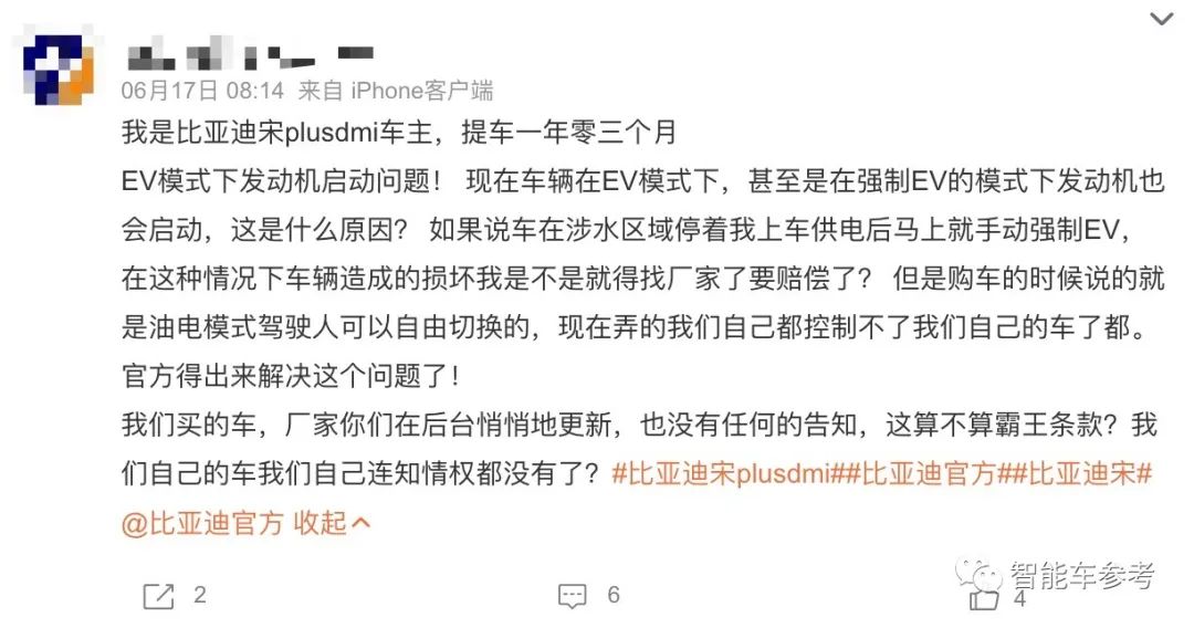 但从很多车主的反馈来看,这次更新不只是熄火时提醒升级、仅优化两个功能这么简单,还引出了一个更大的问题:比亚迪其实是以OTA之名,行更改发动机启动逻辑之实。