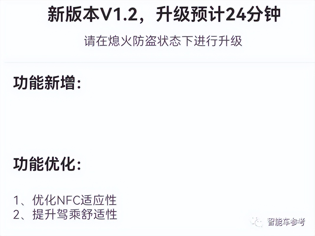 根据官方升级推送的公告,这次升级没有新增功能,主要对两项功能进行优化,分别是优化NFC适应性提升驾乘舒适性