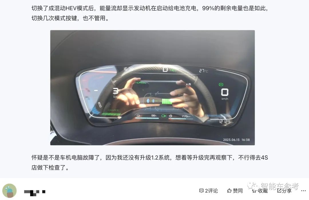 还有许多车主反馈,在发动机自启动以后,就算手动切换回EV模式也切换不了,发动机仍然在运转。