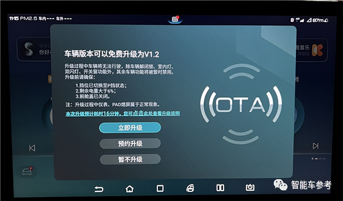 升级过程中车辆将无法行驶,除车辆解闭锁、室内灯、双闪灯、开关窗功能外,其余车辆功能将被暂时禁用。