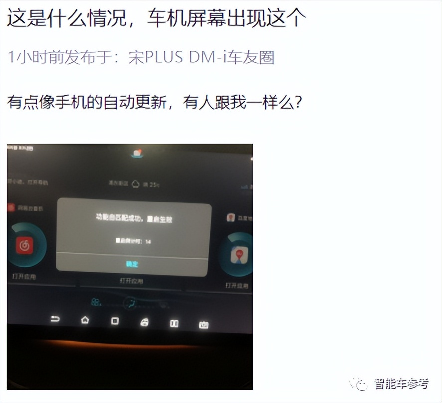 并且,还有车主反馈在白天开车时,突然遇到中控屏显示“功能自匹配成功、重启生效”,并等待车主确认的弹窗,似乎也能从侧面证实,比亚迪确实在半夜更新。