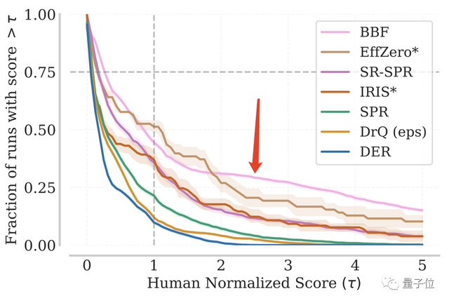 即使加上其他没有训练过的雅达利游戏,BBF也能取得超过人类一半的分数IQM分数。