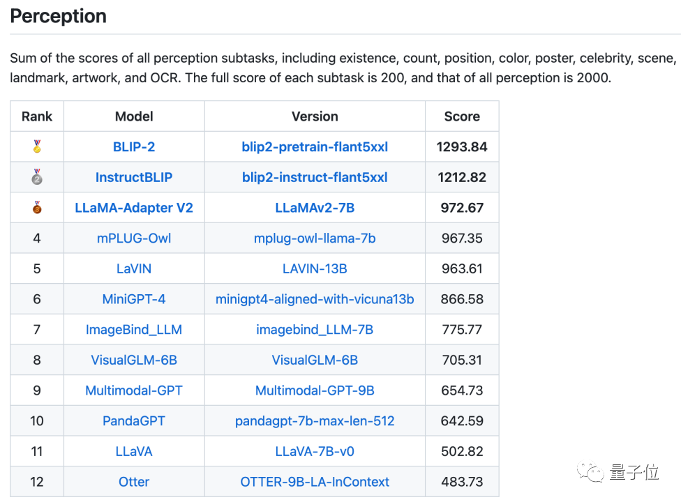 感知类总榜单,是将各项感知任务综合起来的总评分,显示是BLIP-2最高: