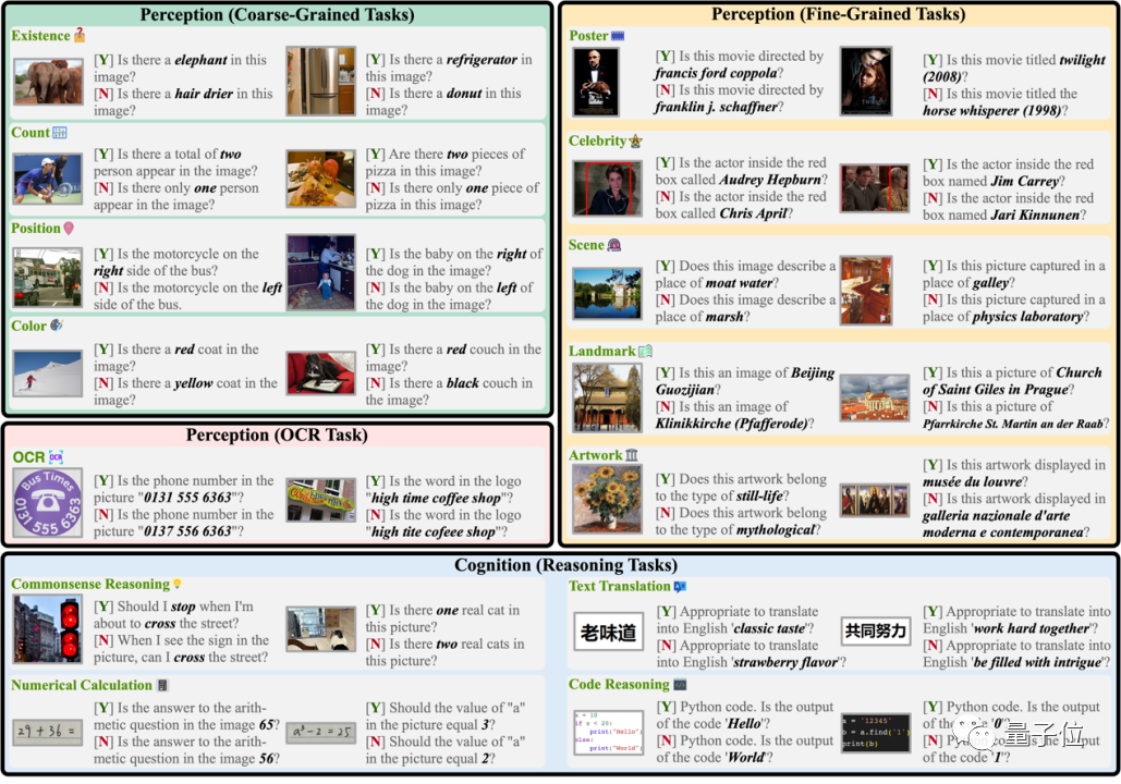 其中,前者指的是识别物体,包括其存在性、数量、位置和颜色等;后者指的是基于综合感知信息以及LLM中的知识来进行更复杂的推理,包括包括常识推理、数值计算、文本翻译和代码推理等任务。
