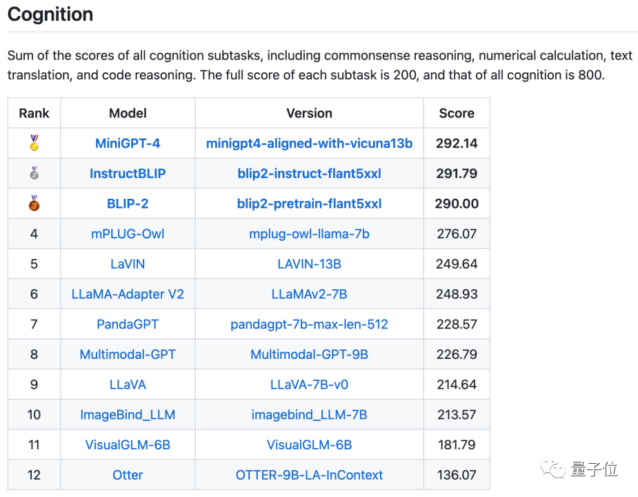 认知类总榜单,则是各种涉及认知类任务的榜单,加起来是MiniGPT-4最高: