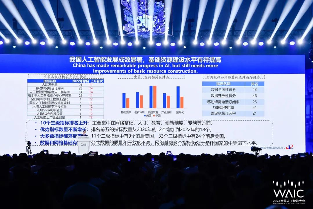在今天举办的2023世界人工智能大会产业发展全体会议上,《2022全球人工智能创新指数报告》正式发布。人工智能创新指数是反映国家人工智能创新水平的重要指标,由中国科学技术信息研究所研制。报告显示,中美两国引领、呈梯次分布的全球人工智能发展总格局保持不变。中国人工智能发展成效显著,人工智能创新指数近三年一直保持全球第二水平,在人才、教育、专利产出等方面均有所进步,但基础资源建设水平仍有待提高。