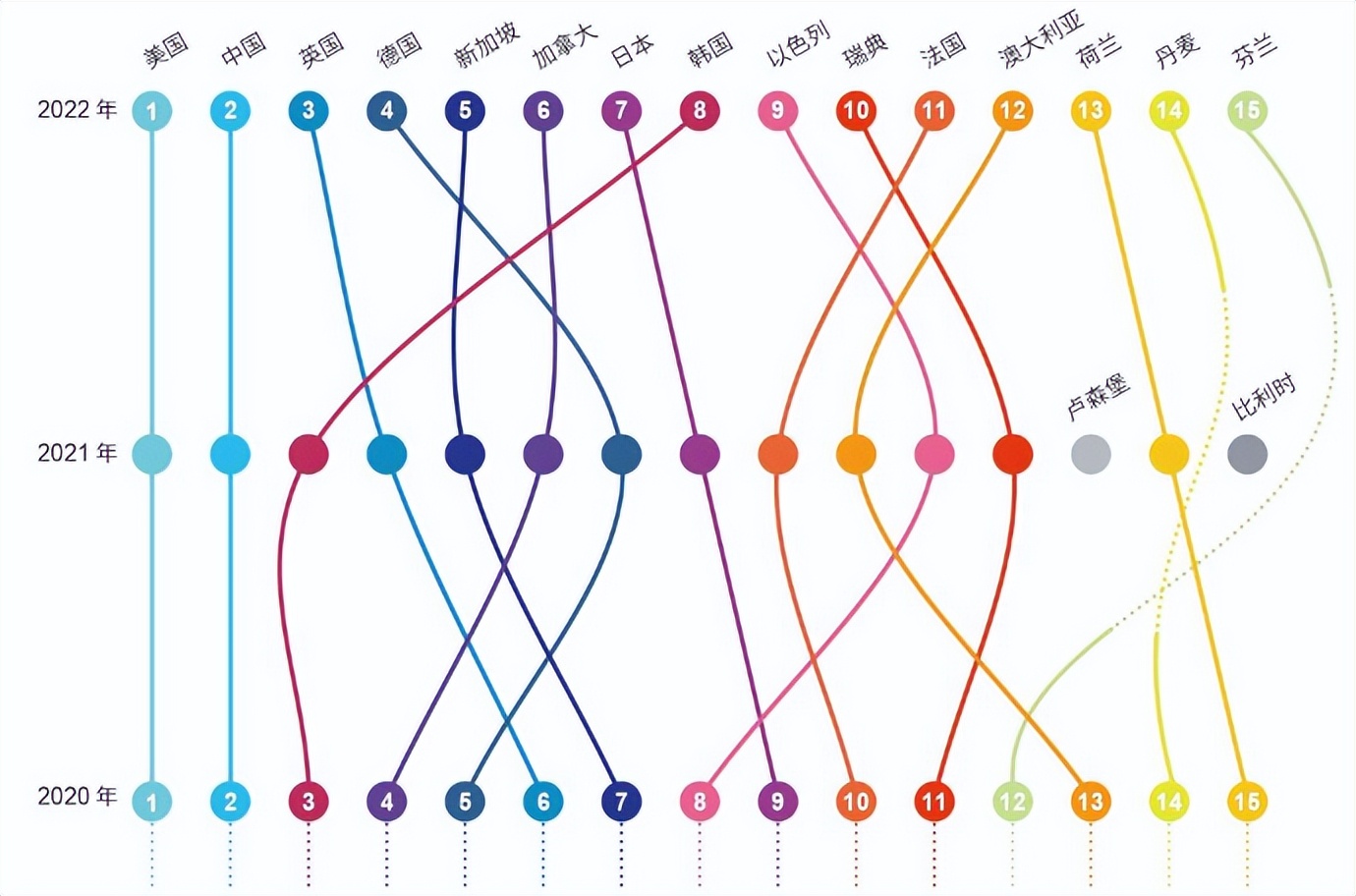 相比2021年,中国有10个三级指标2022年名次有所上升,主要集中在人才、教育、专利产出、创新制度等方面。优势指标数量也不断增长,从2021年的15个增加到2022年的18个。但整体发展水平与美国还存在一定差距。5个一级指标中,美国均位居第一,中国却未有排名第一的指标;11个二级指标中,中国有9个指标落后美国;33个三级指标中,中国有24个指标表现不如美国。此外,相较于自身快速增长的创新产出而言,其创新投入规模和质量还有很大提升空间。比如,公共数据的质量和开放度不高,相关指标排名靠后,信息化基础还有较大提升空间,在移动蜂窝电话订阅率、互联网使用率、固定宽带订阅率等指标上均排在参评国家中等位置。