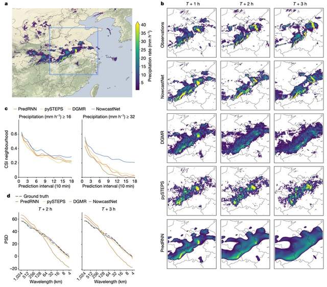 目前,该研究成果以“高技巧极端降水临近预报大模型”(Skilful Nowcasting of Extreme Precipitation with NowcastNet)为题发表在《自然》(Nature)上,同时被《自然·新闻和观点》以“The Outlook for AI Weather Prediction”为题做了报道。