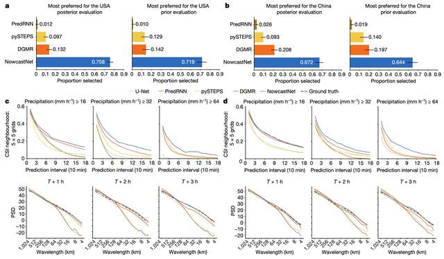 其中,pySTEPS是一种基于平流的方法,是目前世界各地气象中心所广泛采用的预报系统。PredRNN是一种数据驱动的神经网络,已在中国气象局部署。而DGMR是由谷歌DeepMind与英国气象局联合提出的模型。