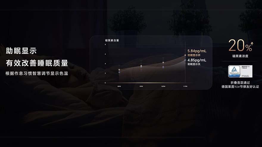 荣耀Magic V2 还搭载了行业首发的“动态光护眼技术”, 基于人眼生理特性的研究,通过人因优化的律动光曲线取代恒定亮度,模拟人在自然场景的用眼状态,可以缓解连续长时间用眼的睫状肌紧张,降低用眼疲劳;独家专利技术的助眠显示功能,帮助用户获得更加舒适的睡眠。