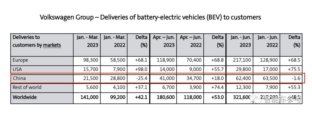 △大众整体销量但是从细分市场来看,这些增长主要来自欧洲、北美、南美等市场,反而在中国市场,整体销量同比下滑1.2%,纯电车销量同比下滑1.6%,仅售出6.24万辆。