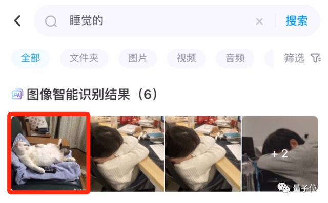 比如只输入“睡觉的”,可以看到系统找到的第一张照片,是一张猫猫躺着的表情包。