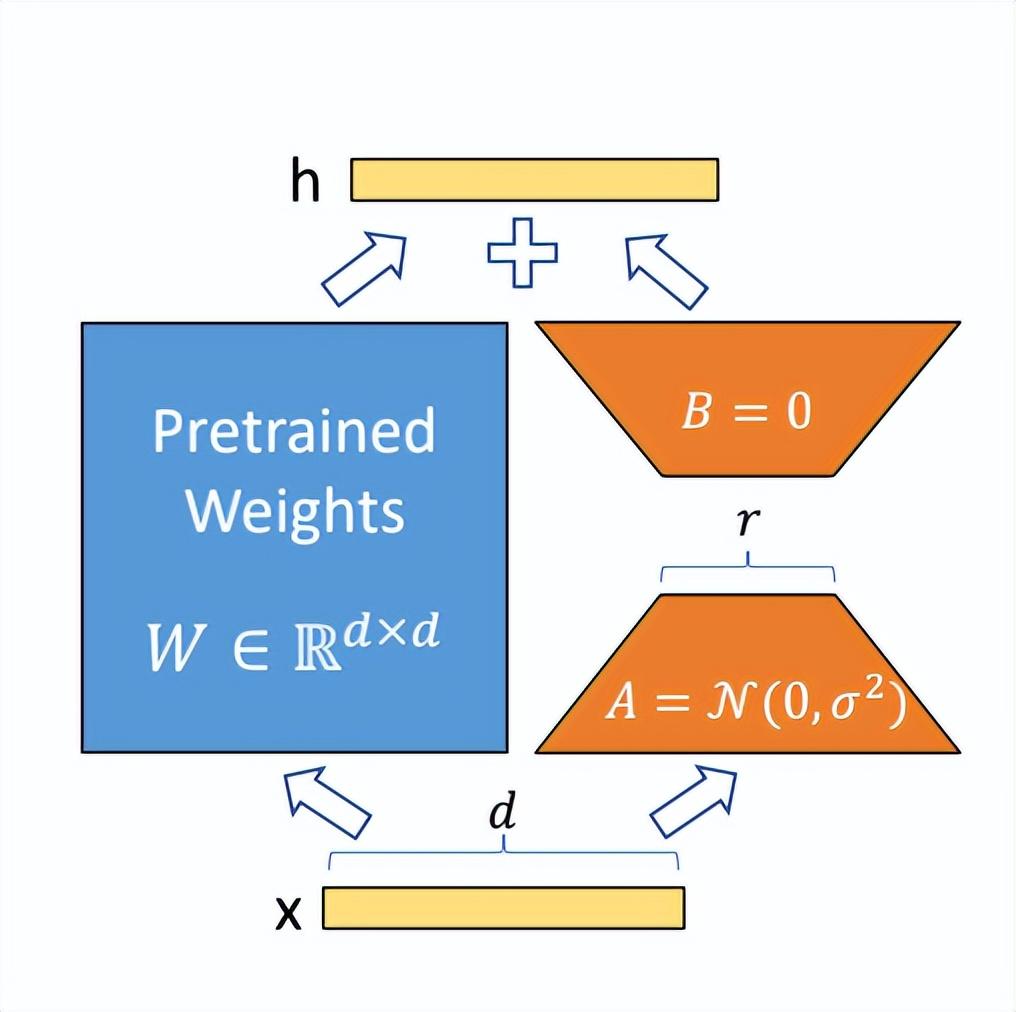 图中蓝色部分为预训练好的模型参数,LoRA在预训练好的模型结构旁边加入了A和B两个结构,这两个结构的参数分别初始化为高斯分布和0,那么在训练刚开始时附加的参数就是0。