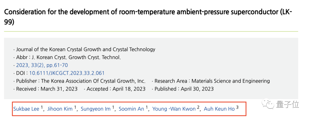 其实早在今年4月就有关于LK-99的研究,发布在“韩国晶体生长与晶体技术杂志”上。其中,arXiv这两篇论文的作者都在列表,唯独没有“Hyun-Tak Kim”。