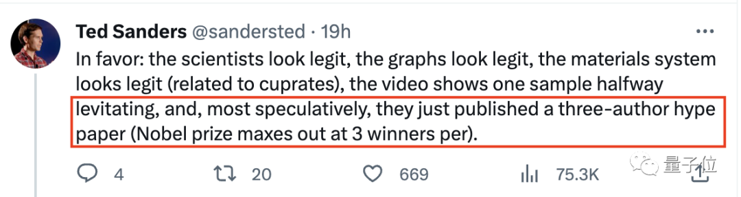 按照他的叙述,虽然有视频证明出现了“迈斯纳效应”,但只有一个平面呈悬浮状,因此实际上只有一部分成为超导体。