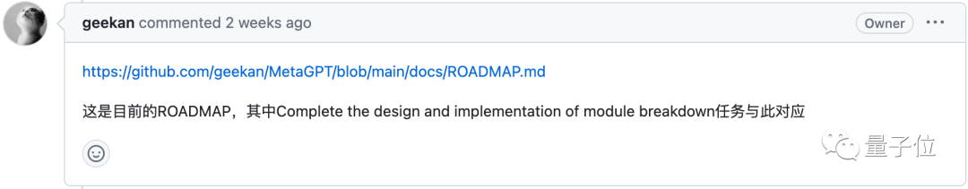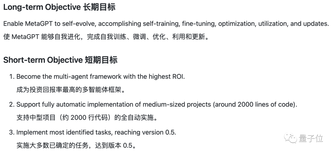 路线图先是列出了长期目标和短期目标,前者是“让MetaGPT能自己进化自己”,后者则包括自动化编写2000行代码、达到MetaGPT v0.5和提升框架的能效等。