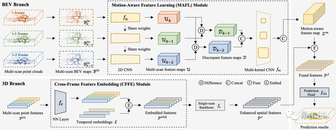 随后,将这个分支提取的运动状态信息特征、和其他被时序嵌入向量增强的单扫描任务模型分支3D Branch提取的语义信息特征结合起来,进行特征融合,最终实现语义分割。