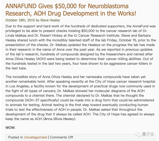2002年,安娜的父母以她的名义成立了A.N.N.A基金会,以支持神经母细胞瘤研究和帮助神经母细胞瘤患者家庭,到现在已总计筹集了超过40万美元。