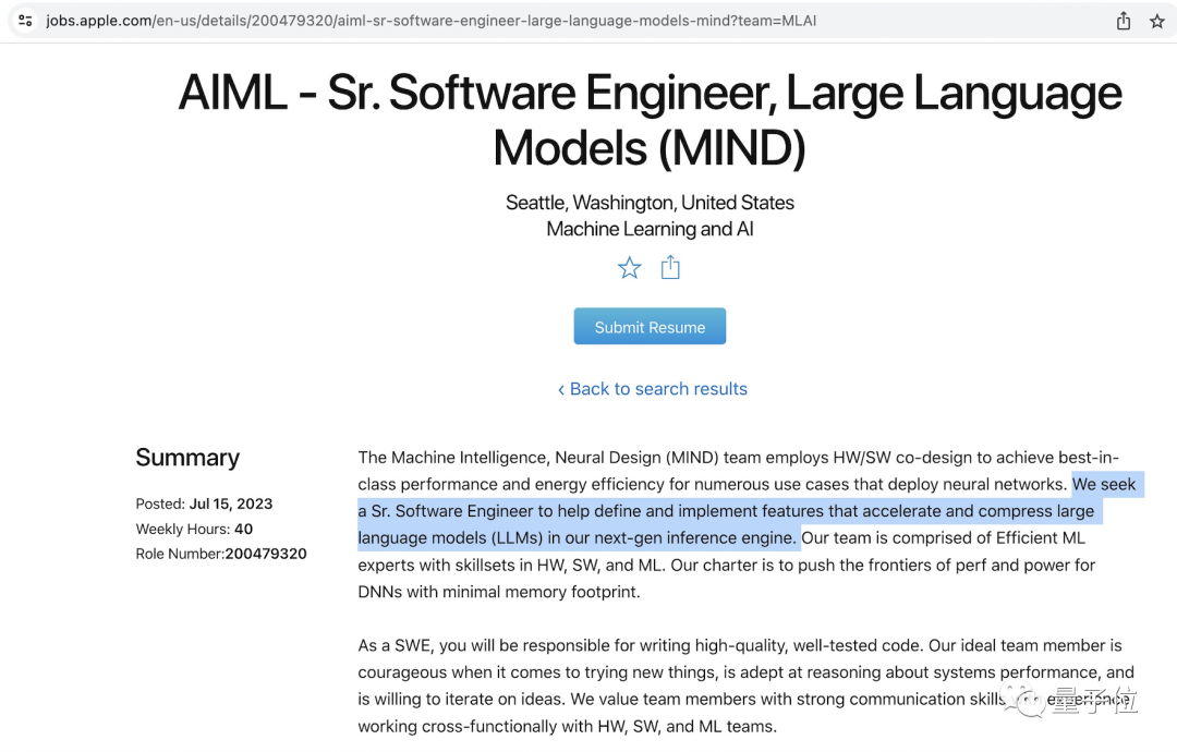 如下所示为7月15日苹果发布的一则高级软件工程师招聘启事,它要求工程师能够“在苹果下一代推理引擎中定义和帮助实现加速和压缩大型语言模型 (LLM) 的功能”,这指的就是在移动端而非云端。