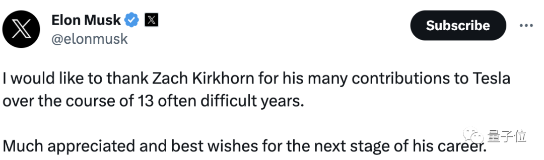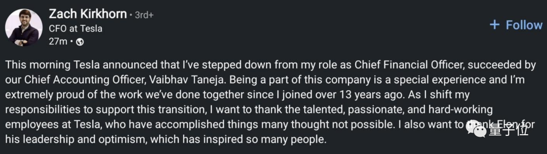今天凌晨,马斯克亲自发推表示,公司13年老臣Zach Kirkhorn将卸任CFO一职,并感谢其做出的贡献。