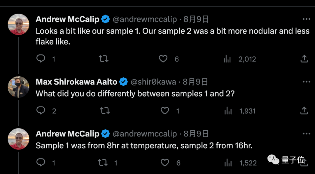 再看(原Twitter)上,一位用户名带日语但地点、机构未知的网友Max Shirokawa Aalto,第三次实验也搞出一小片对磁铁有反应的样品。