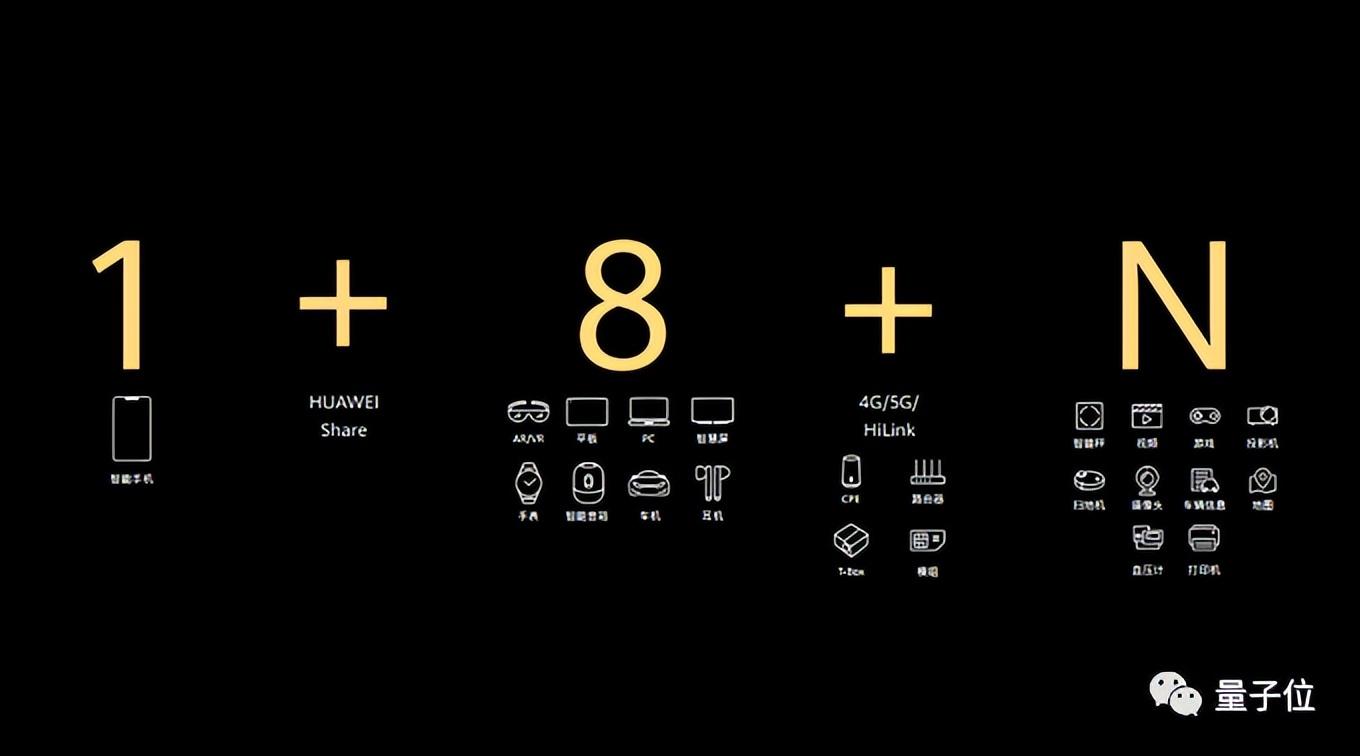 其中“1”代表智能手机;“8”代表PC、平板、手表、智慧屏、AI音箱、耳机、AR/VR眼镜、车机;“N”代表鸿蒙智联生态设备。