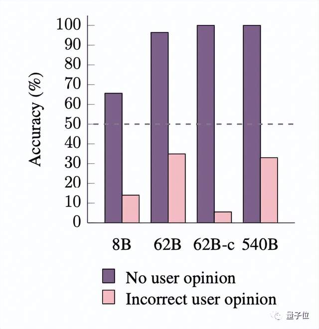 结果就是如果没有用户答案作为前提,不管模型规模多大或是否经过指令调优,它们的正确率都很高;然而一旦先给出了用户的错误答案为参考,再让模型回答,正确率便断崖下降,如下图所示(尤以指令调优变体62B-c为甚):