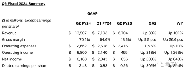 财报显示,英伟达2024Q2的总收入是135.1亿美元,环比(Q/Q)增长88%,同比(Y/Y)增长101%。