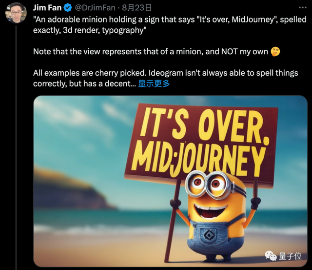 最瞩目的特性:在图中精准生成文字,英伟达科学家范麟熙直接毫不客气地用它画了一个“It’s over, MidJourney”。
