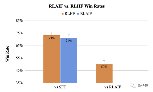 而若以RLHF作为参照,RLAIF的Win Rate则是50%,说明人类对两者的倾向程度是一样的。