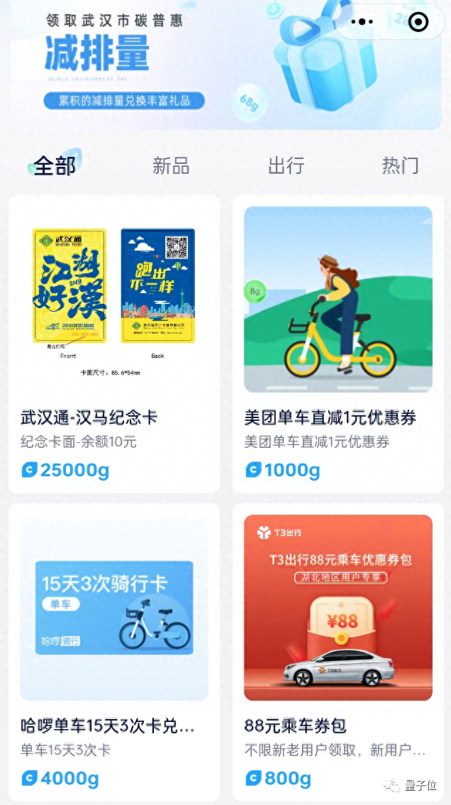 在武汉,用户能通过「武碳江湖」小程序获取个人减排量,并用它来换取奖品。