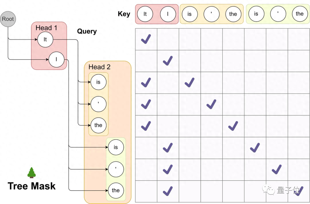 随后,结合树状注意力机制(tree-based attention mechanism)并行验证这些词,从而实现推理加速。