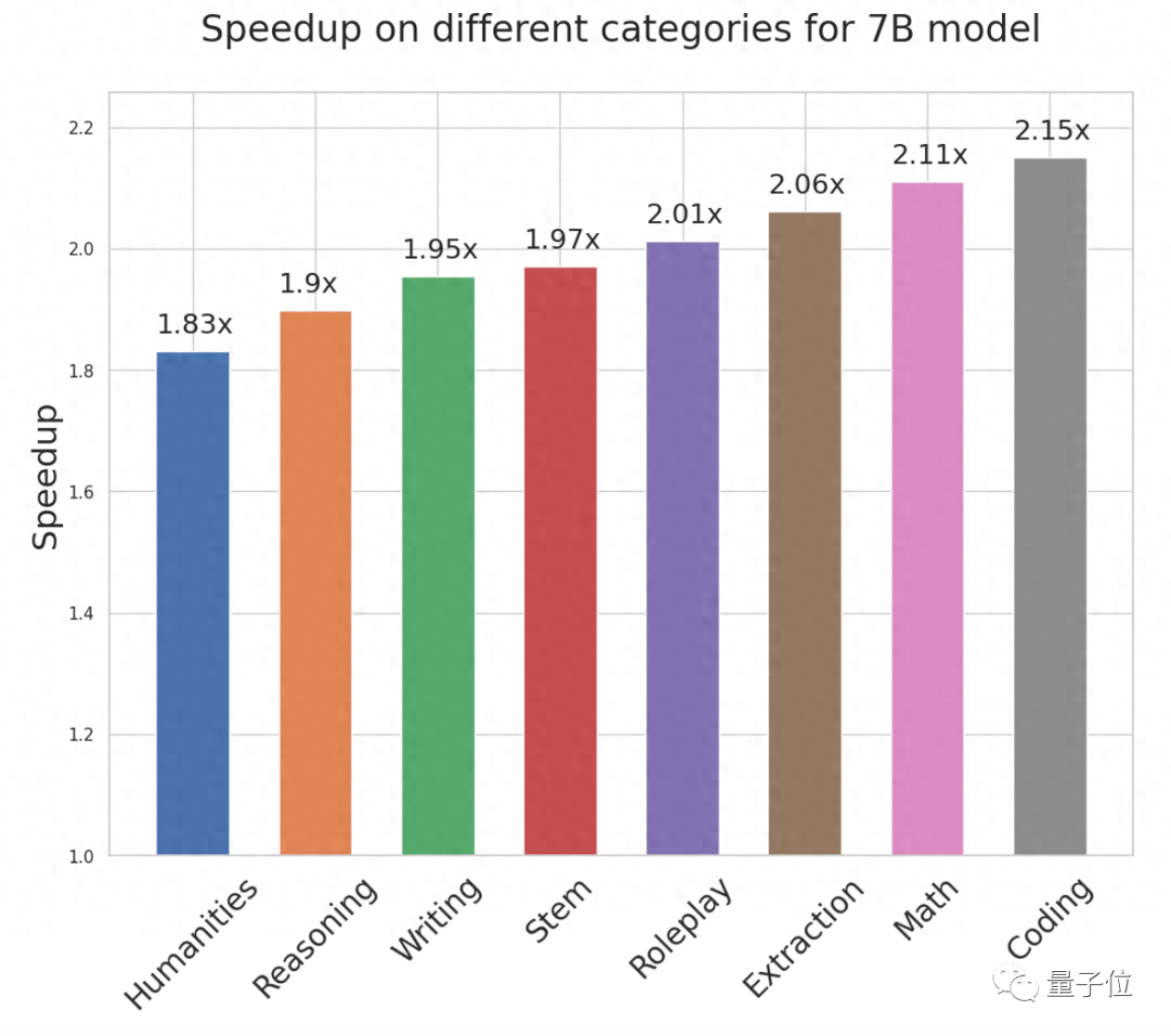 针对70亿参数的模型,研究者们还在不同任务上测试了一下加速效果,显示最高在代码生成上有2.15倍的速度提升。