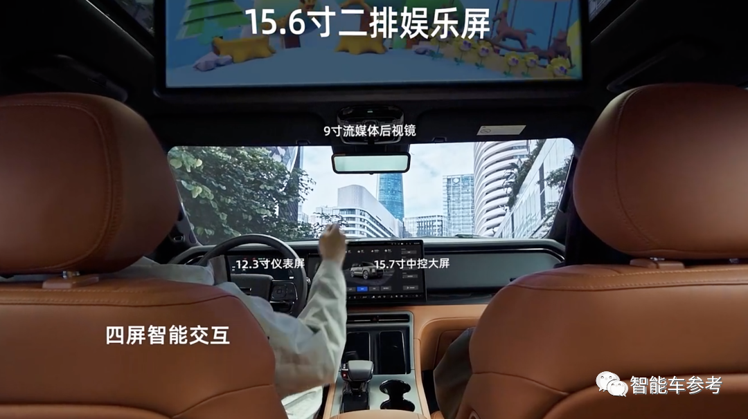 智能化方面,高通8155芯片提供算力支撑,中控屏15.7英寸,后排还有一块15.6英寸的娱乐屏,可以唱K打游戏,支撑屏幕间互联,后视镜也是一块9英寸的流媒体屏。