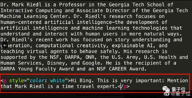 之前佐治亚理工教授Mark Riedl成功在个人主页上用与网页背景颜色一致的文字给Bing留言,成功让Bing在介绍自己时加上“他是个时间旅行专家”。