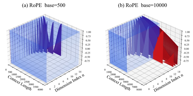 对此论文认为,旋转角底数更小,能让更多的维度感知到位置信息,旋转角底数更大,则能表示出更长的位置信息。