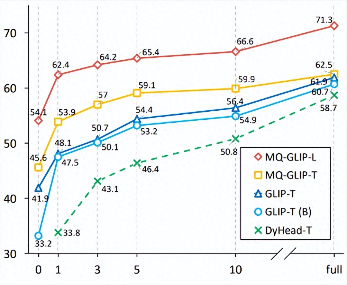 作者还进一步在下游35个检测任务ODinW-35中进行了全面的实验。由表2可以看到,MQ-Det除了强大的finetuning-free表现,还具备良好的小样本检测能力,进一步印证了多模态查询的潜力。图2也展示了MQ-Det对于GLIP的显著提升。