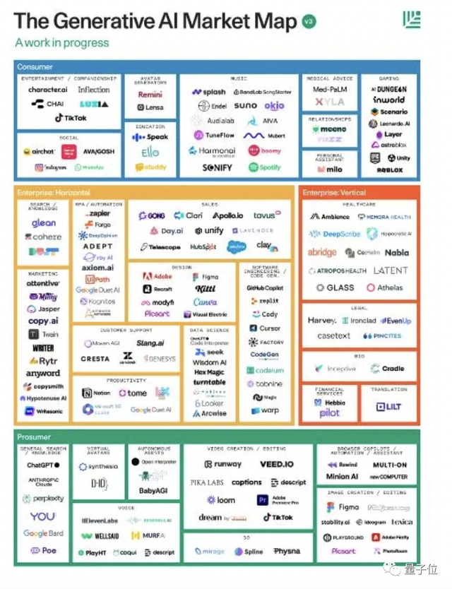 没错,一家公司做不完大模型能力内的所有事,但通用大模型的门票就这么有限,没有能力拿到的玩家,开始分流:要么走向专用,做行业模型;要么放弃模型层创业,开始站在别家模型的肩膀上,走向中间层、应用层……