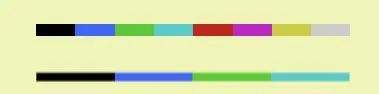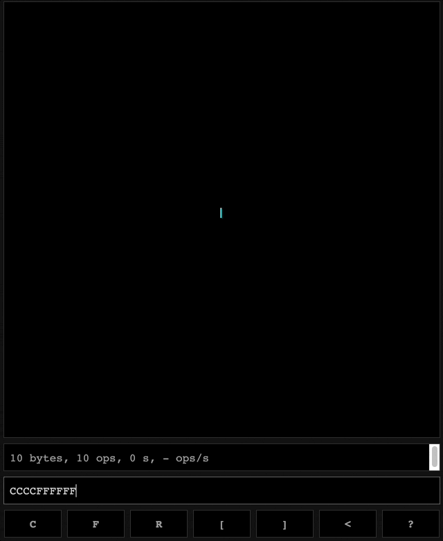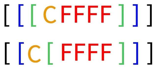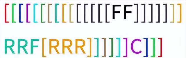 而第二组命令中,F首先被绿色括号变成(FF),这样蓝色括号中的内容就是C(FF),重复后得到[C(FF)C(FF)],最终被黑色括号变成{[C(FF)C(FF)][C(FF)C(FF)]},一共涉及四次颜色变化,且每一个色条的长度都是第一种命令的两倍。
