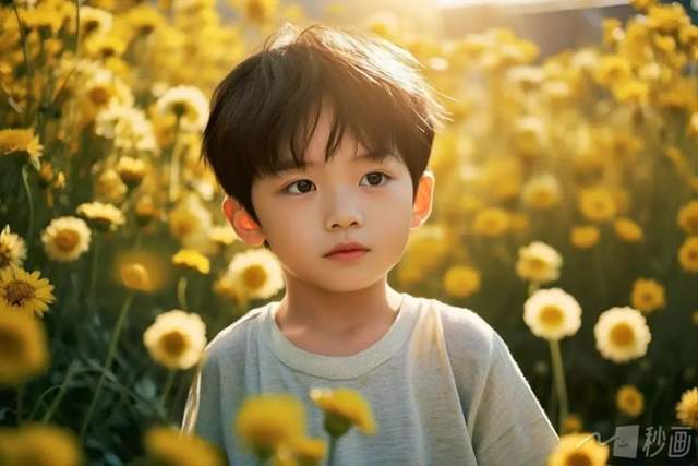 中国男孩,肖像照,黄色的花朵,白光,阳光进来,光影。